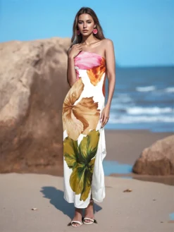 Women Strapless Dress Colorful Printed Ruffle Long Pleated Dress Summer Bohemian Holiday Clothes
