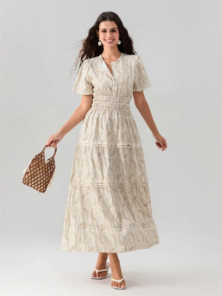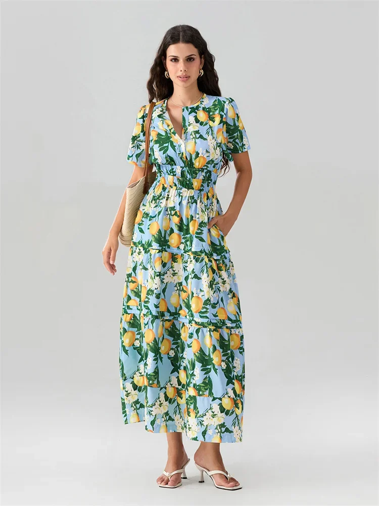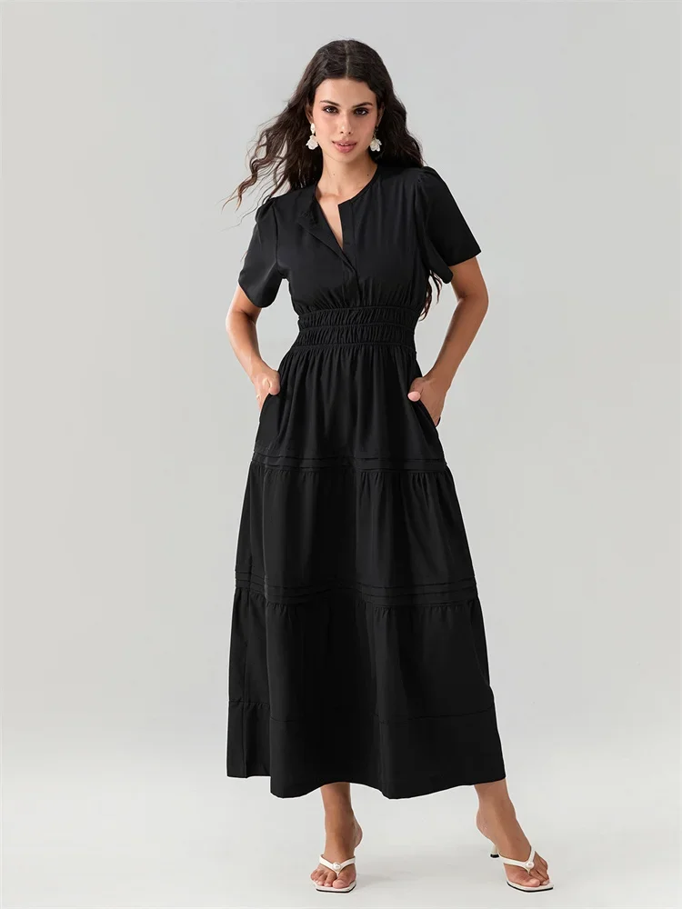 Women Long Dress Smocked Waist Pintucked Hem Side Slant Pockets V-Neck Short Sleeve Flowy Dresses